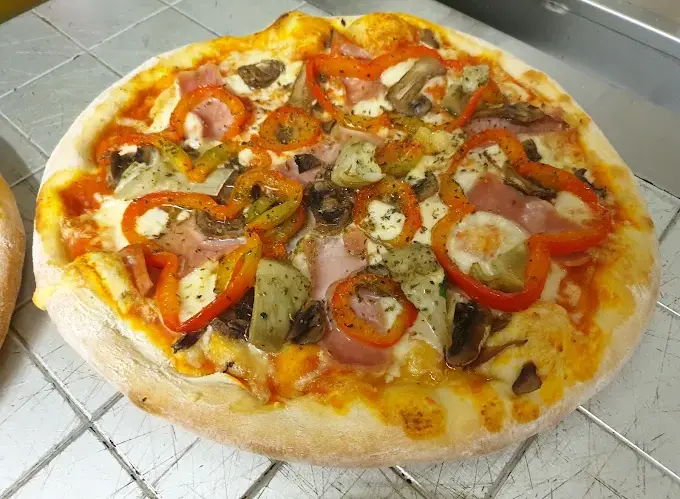 mit Oliven, Champignons, Salami 1 2 3 5 6, Schinken 2 5 6 und Paprika